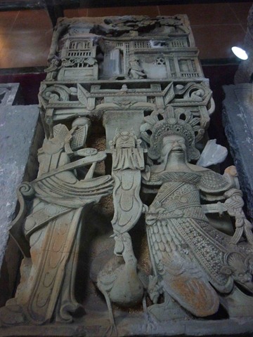 下面的這塊石雕 雕的是 一個文官跟一個武官來送烏紗帽給新上任的狀元吧
